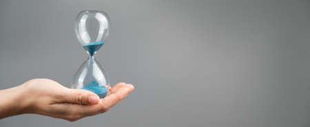 Woman holding an hourglass on a gray background. Close-up. Copy space.