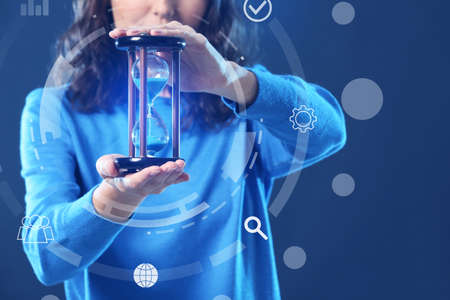 Woman with hourglass on dark background. Time management concept