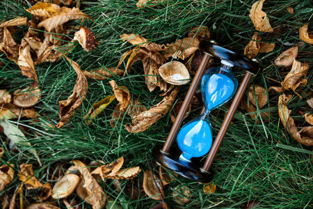 Sand running through the bulbs of an hourglass measuring the passing time in a countdown to a deadline, on a colorful background with copy space. Abstract old sand-glass in forest. Selective focus
