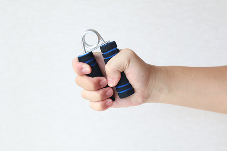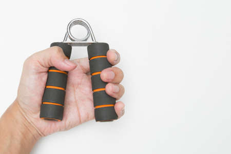 The hand is holding Hand grip for finger exercise on white background and copy space