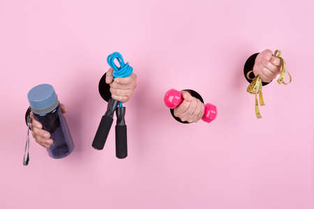 Closeup female hand is holding pink dumbbell in torn hole of yellow studio background with copyspace. Gesturing, holding, presenting things. Negative space for your advertising. Showing, pointing.