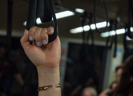 Womans hand holding handrail handle on crowded subway training
