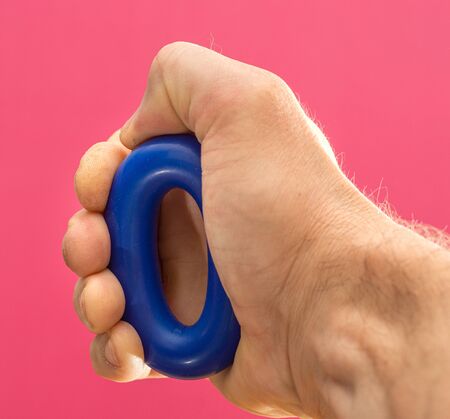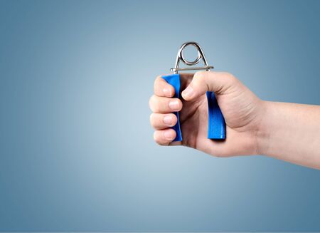 hand squeezes a metal expander on a blue background