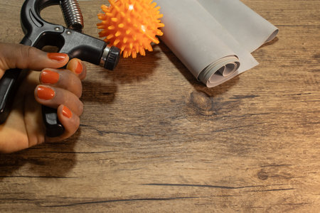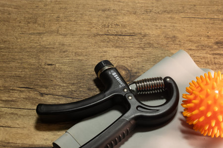 Top view of Hand grip for finger exercise on the wooden table and copy space