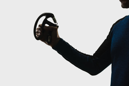 Arm of muscular strong man doing exercise with hand expander isolated on studio background. Silhouette of hand gripping expander on plain background