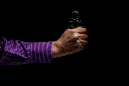 Hand gripping a hand strenghener under tension as a metaphor for executive stress. Shot on black background