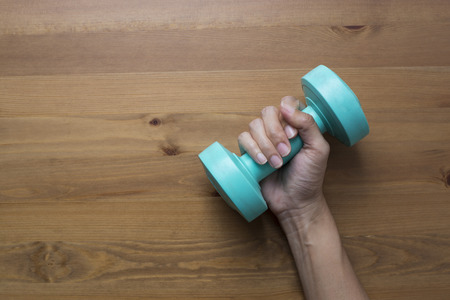 woman hand holding green dumbbell on wood table background