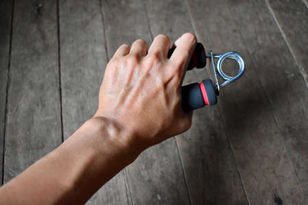 Southeast asian, Chinese young man’s right hand gripping hand exercise gripper.