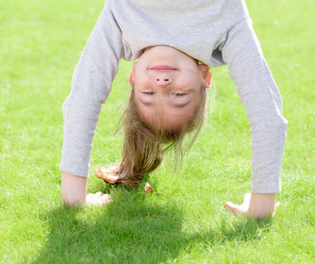 Joyful little girl child stands upside down on hands