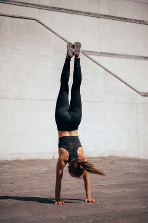 parkour woman doing handstand in the city. Urban background . Vertical photo.