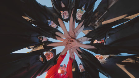 Graduates in academic gowns come together in a circle, representing unity, success, and the beginning of a new phase in their journey