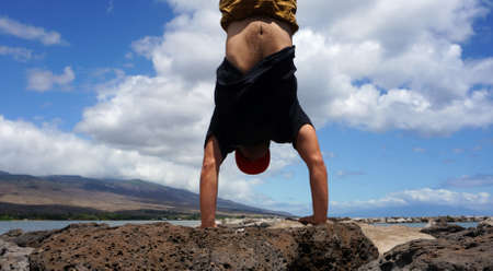 Man Handstands on Lava rocks of Molokai Harbor in the state of Hawaii.