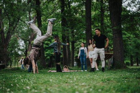 Group of friends enjoying outdoor activities in a lush green park