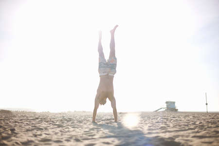 Mid adult man doing handstand on beach