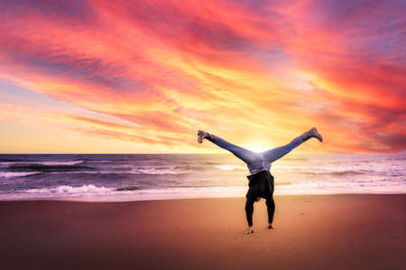 Joyful girl does a somersault on the beach by the sea, against the backdrop of the spectacular sunset. Concept of happiness and beauty of nature.
