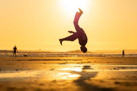 Man performing dynamic backflip on beach at sunset