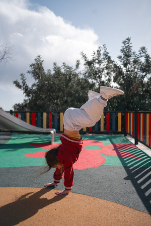 Child girl doing handstand on the outdoors playground. Funny active exercise