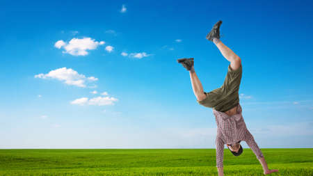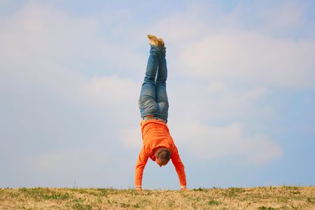 Man stand upside down against a cloudy sky