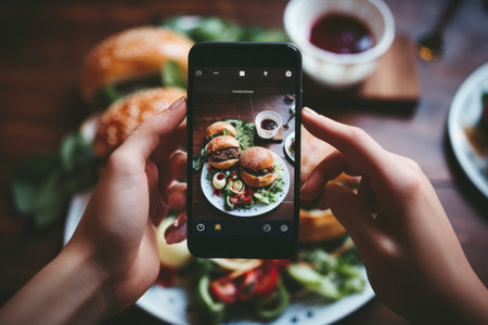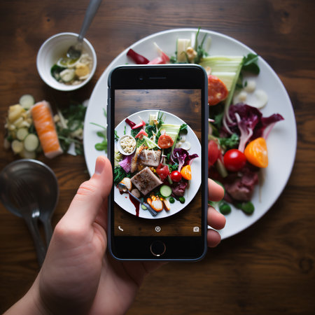 An AI illustration of An AI generated illustration of A young adult using a mobile device to capture a close-up image of a delicious meal
