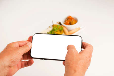 mobile phone blank screen in hands, taking pictures of food plate