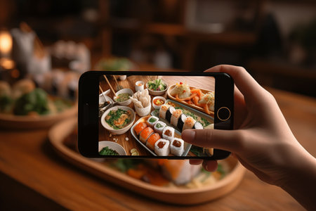Skillful person taking photo of sushi plate on a smartphone