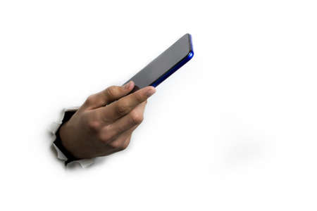 Person typing something on mobile phone with a blank screen, photo isolated on black background