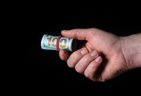 Person is hand holding dollars in hand on black isolated background. Bribery idea and corruption