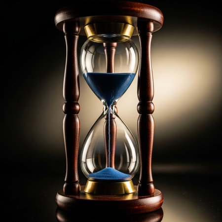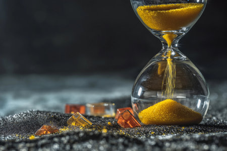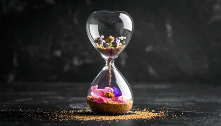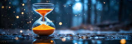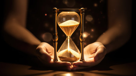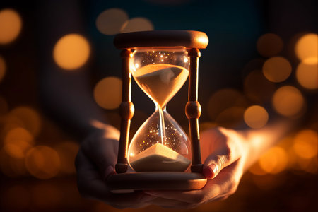 An elegant hourglass with golden sand flows beautifully, set against a dark backdrop with a glowing bokeh effect, symbolizing time