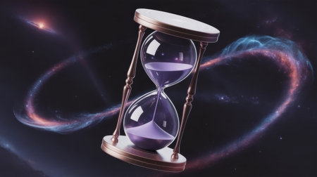 An hourglass filled with purple sand floats in deep space amidst swirling cosmic nebulae and a distant galaxy.