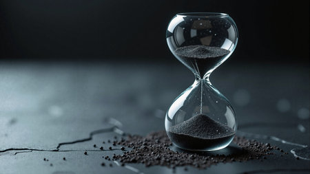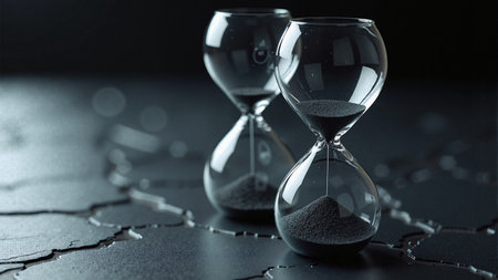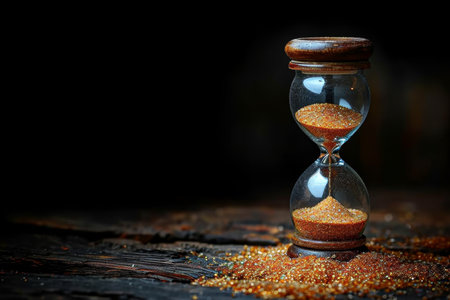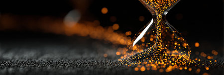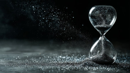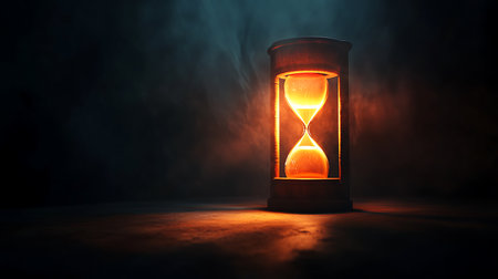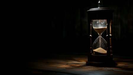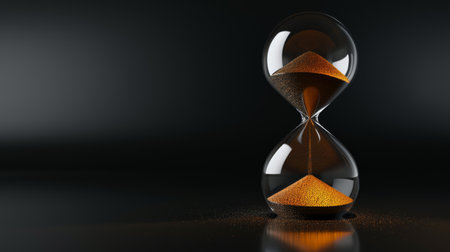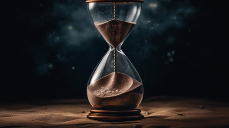 Witness time's passage with an hourglass on a dark backdrop. Perfect for banners and copy space. Generative AI