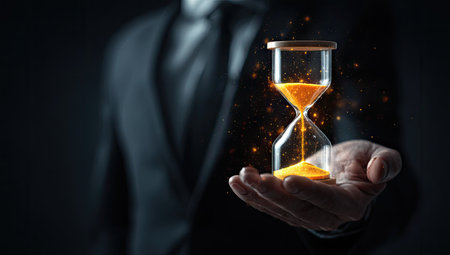 An individual in a dark suit presents an hourglass with glowing particles. The image shows a close-up perspective, highlighting the detailed texture of the glass and the luminous sand. It features a dark background, suggesting a formal or professional setting. Suitable for themes related to time, business, and deadlines in various commercial applications.
