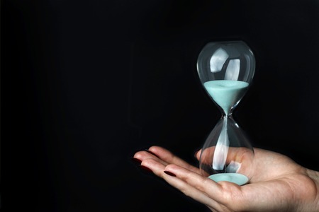 Close-up of a woman holding an hourglass. Time goes by and time runs out. Countdown timer