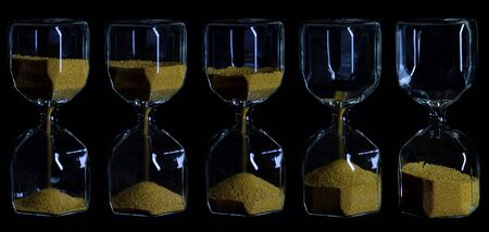 Series of five hourglasses that mark the passage of time on a dark background