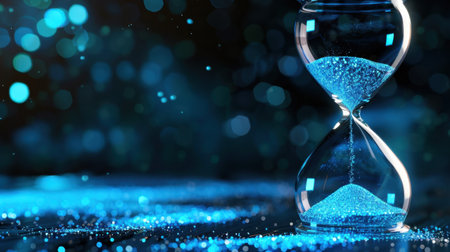 This captivating image features an hourglass with blue sand shimmering against a sparkling backdrop, symbolizing the flow of time and transitions.