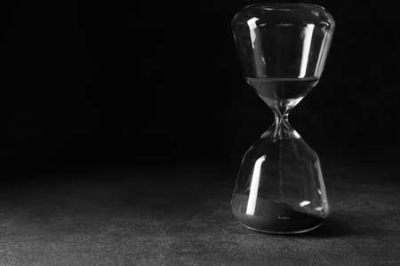 Hourglass with falling sand inside a glass bulb, passing time or lost time on a dark background with space for text.