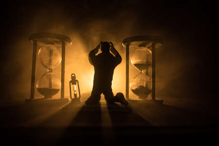 Time concept. Silhouette of a man standing between hourglasses with smoke and lights on a dark background. Surreal decorated picture
