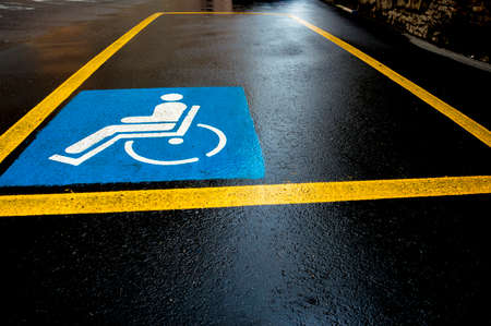 Wheelchair Handicap Sign on dark asphalt road background-street handicapped parking place