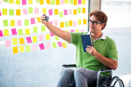 Handicapperd businesswoman in a wheelchair on meeting with her diverse business team brainstorming at office