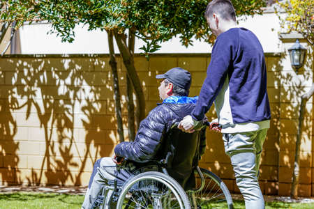 Disabled man in wheelchair and young caregiver carrying the chair and enjoying the fresh air, happy in a garden.