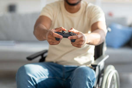 Cropped view of handicapped black guy in wheelchair enjoying online videogame, having fun at home, closeup