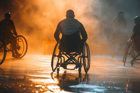 A man in a wheelchair navigates through a misty, foggy area, surrounded by a veil of mystery and solitude in his journey.