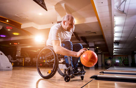 Close-up of sportsman in wheelchair holding ball in his hands, he playing basketball outdoors