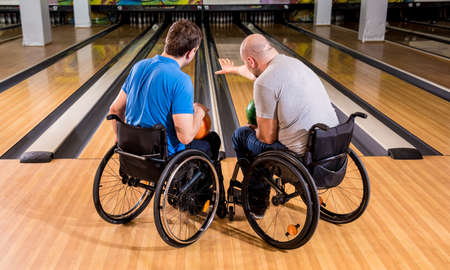 Mature man with disability sitting in wheelchair and talking about his experience in basketball game to young athlete
