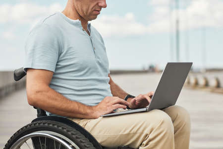 Cropped side view portrait of adult man in wheelchair using laptop outdoors, copy space