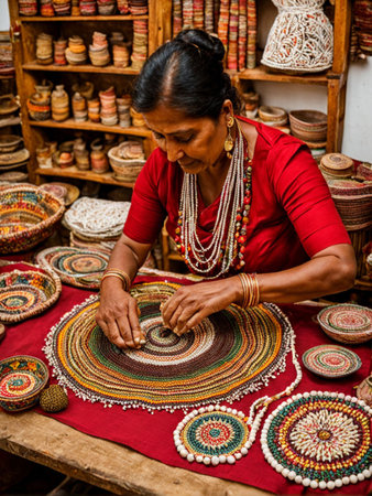 With focused precision, an artisan's experienced hands meticulously thread colorful beads, transforming tiny elements into a vibrant piece of wearable art.