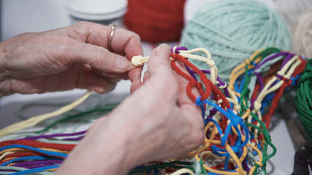 Close-up of woman weaving net of ropes. Art. Old womens hands masterfully tie knots and weave colored ropes into net. Creative fair with handmade items and decorations