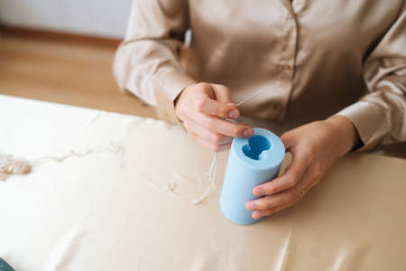 Close-up high-angle view of unrecognizable female artisan putting wick through silicone mold preparing for pouring liquid wax. Process of making handmade natural candle at workshop.
