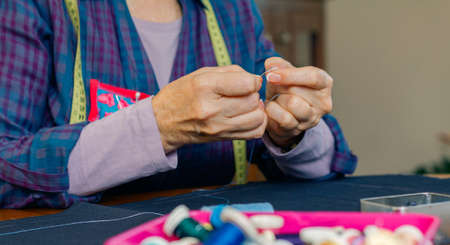 Detail of hands of senior female dressmaker threading a needle