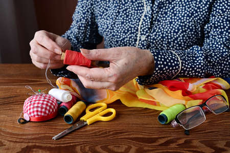 hands of an elderly woman with a sewing needle and thread. Seamstress's hands at work close-up. Handmade work. Needlework and sewing
