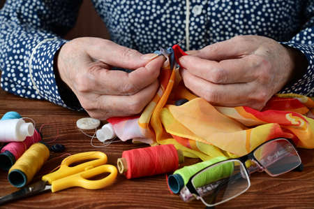 hands of an elderly woman with a sewing needle and fabric. Tailor's hands at work close-up. Handmade work. Needlework and sewing